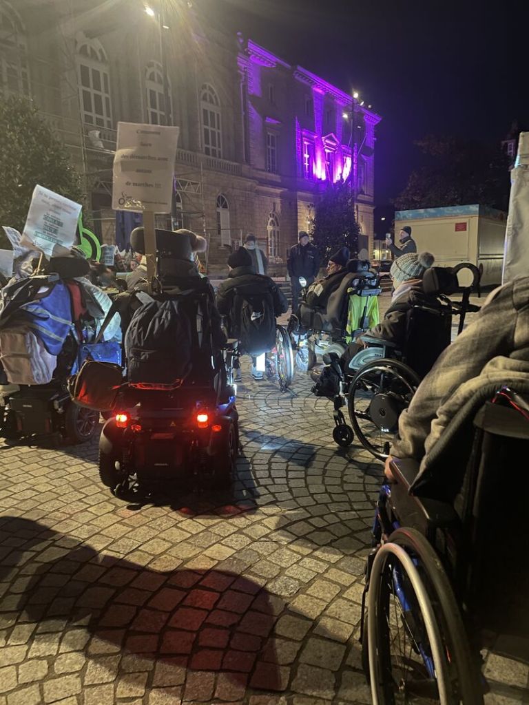 A l’occasion des 20 ans de la loi du 11.02.2005, APF France handicap, soutenue notamment par d’autres associations locales, s’est mobilisé le lundi 10 février jusqu’au petit matin du 11 février 2025 à Quimper sur la place Saint Corentin.