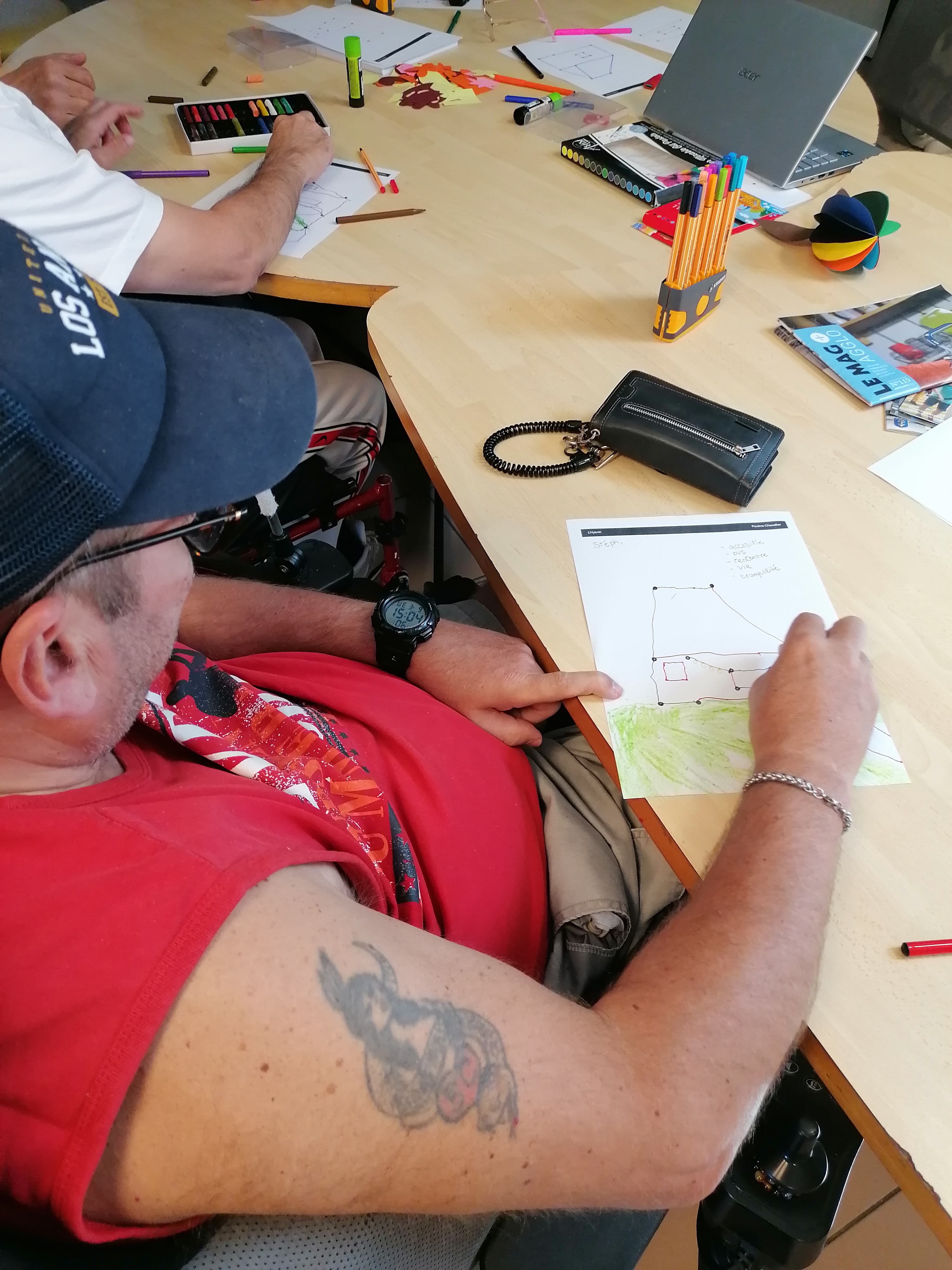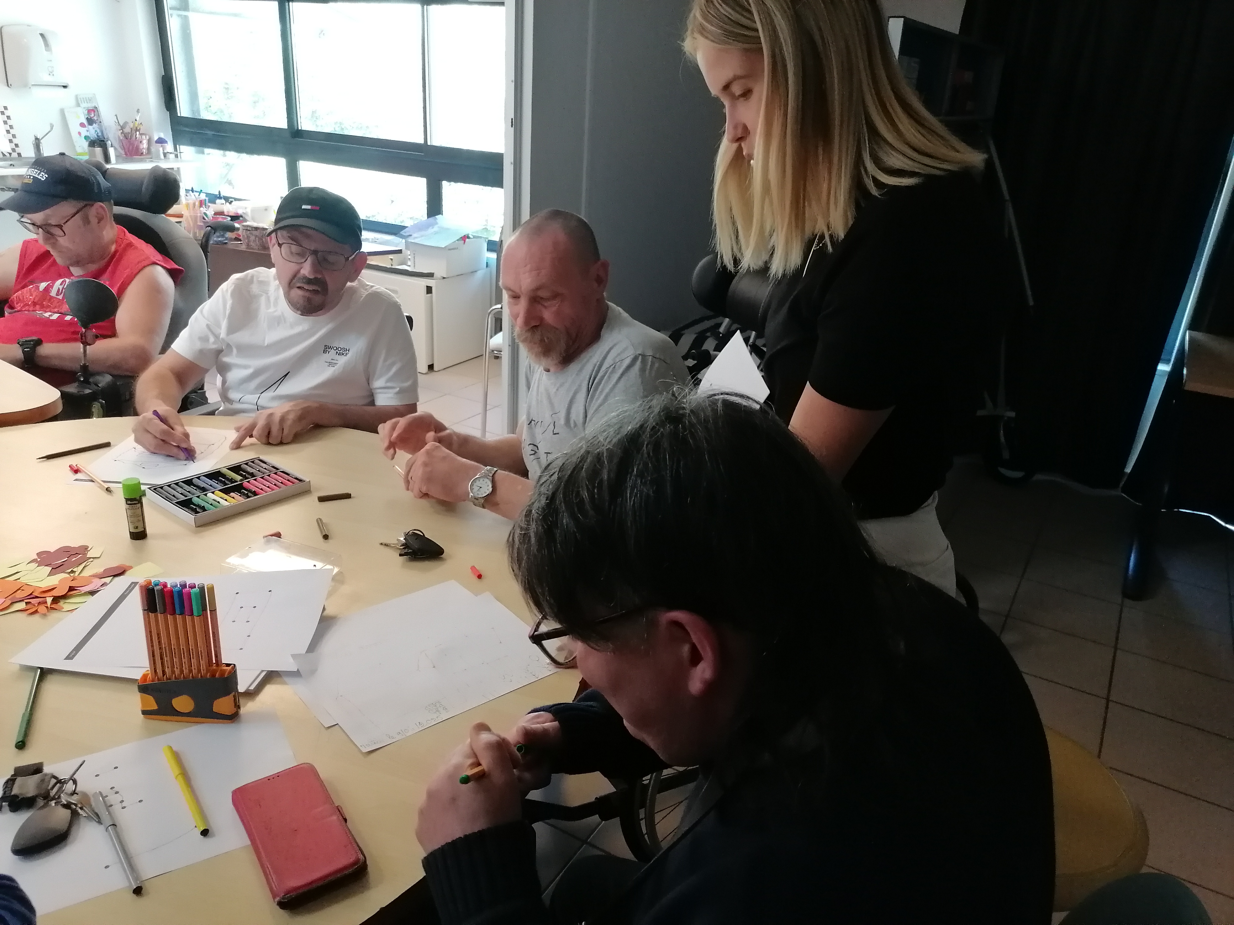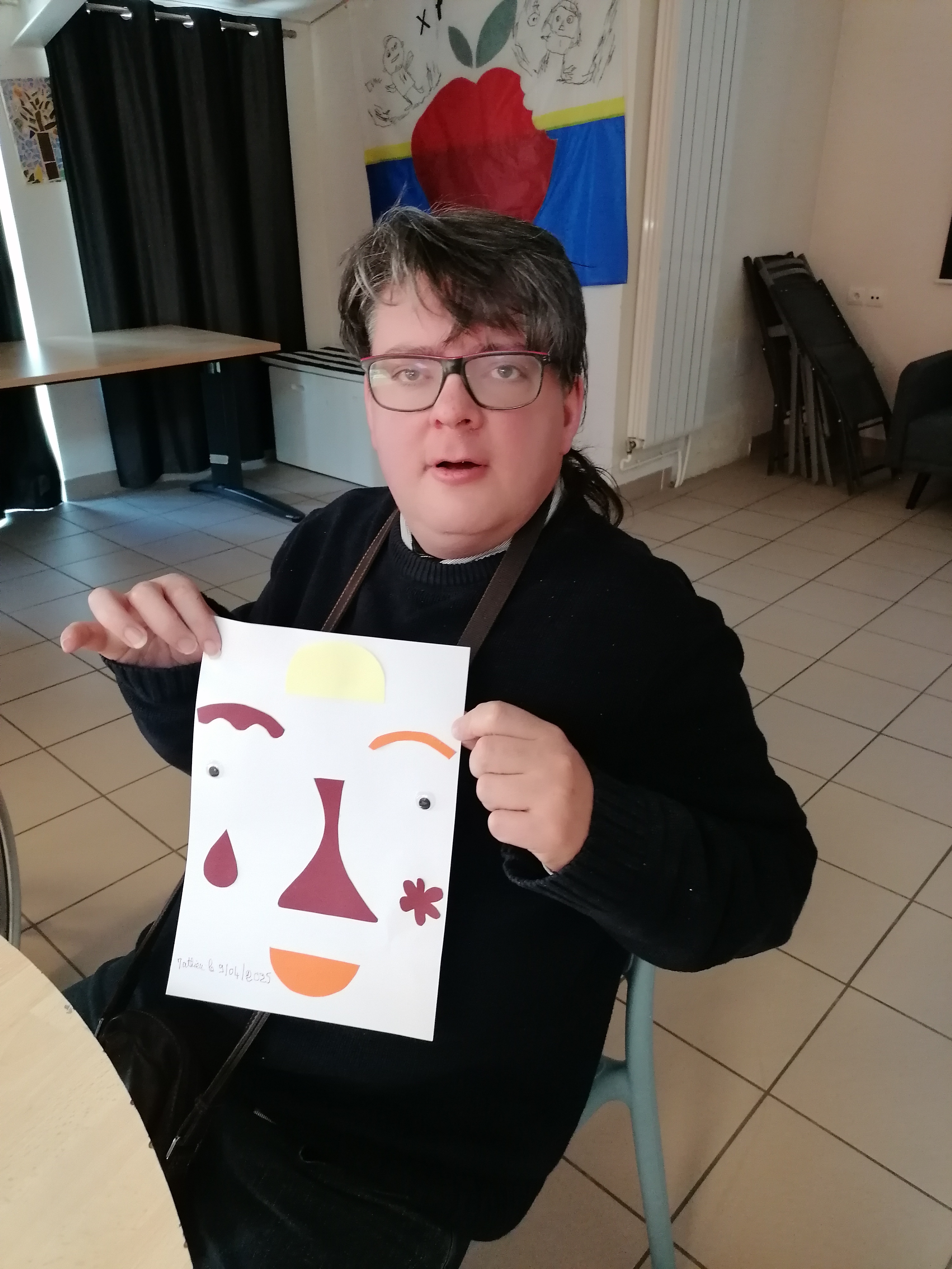 Elle nous a proposé un atelier avec deux exercices le mardi 8 avril. Le premier consistait à dessiner des instruments de musique ou une maison en reliant des points, ou en dessinant nous mêmes comment on se représentait notre habitat ou la culture. Cela consistait a nous aider à traduire nos souhaits de nouvelle forme d’habitation et l’apport de l’art dans dans une dynamique inclusive. Le deuxième exercice on devait créer un visage en assemblant différentes formes prédécoupées et de couleurs différentes. Elle nous a demandé pour terminer quelle était notre couleur préférée.