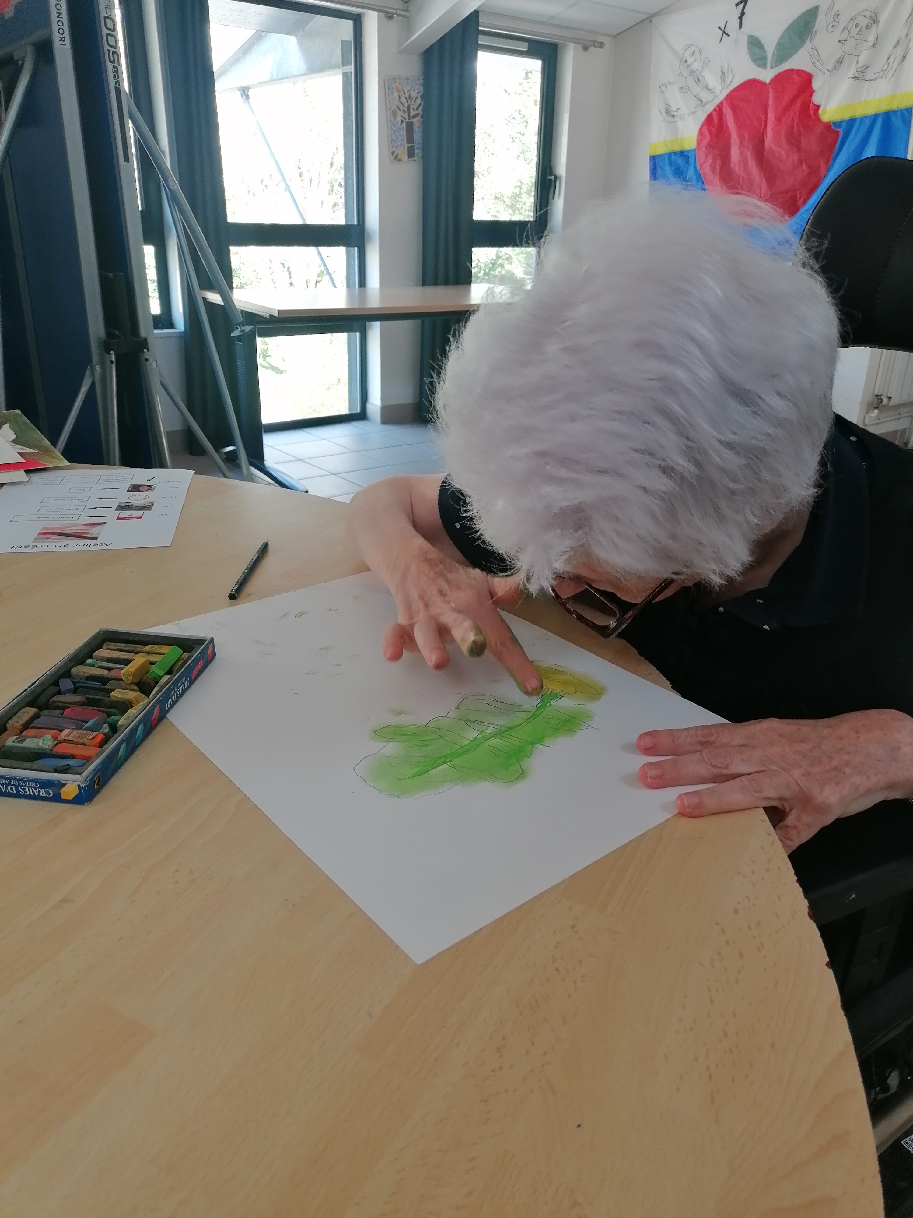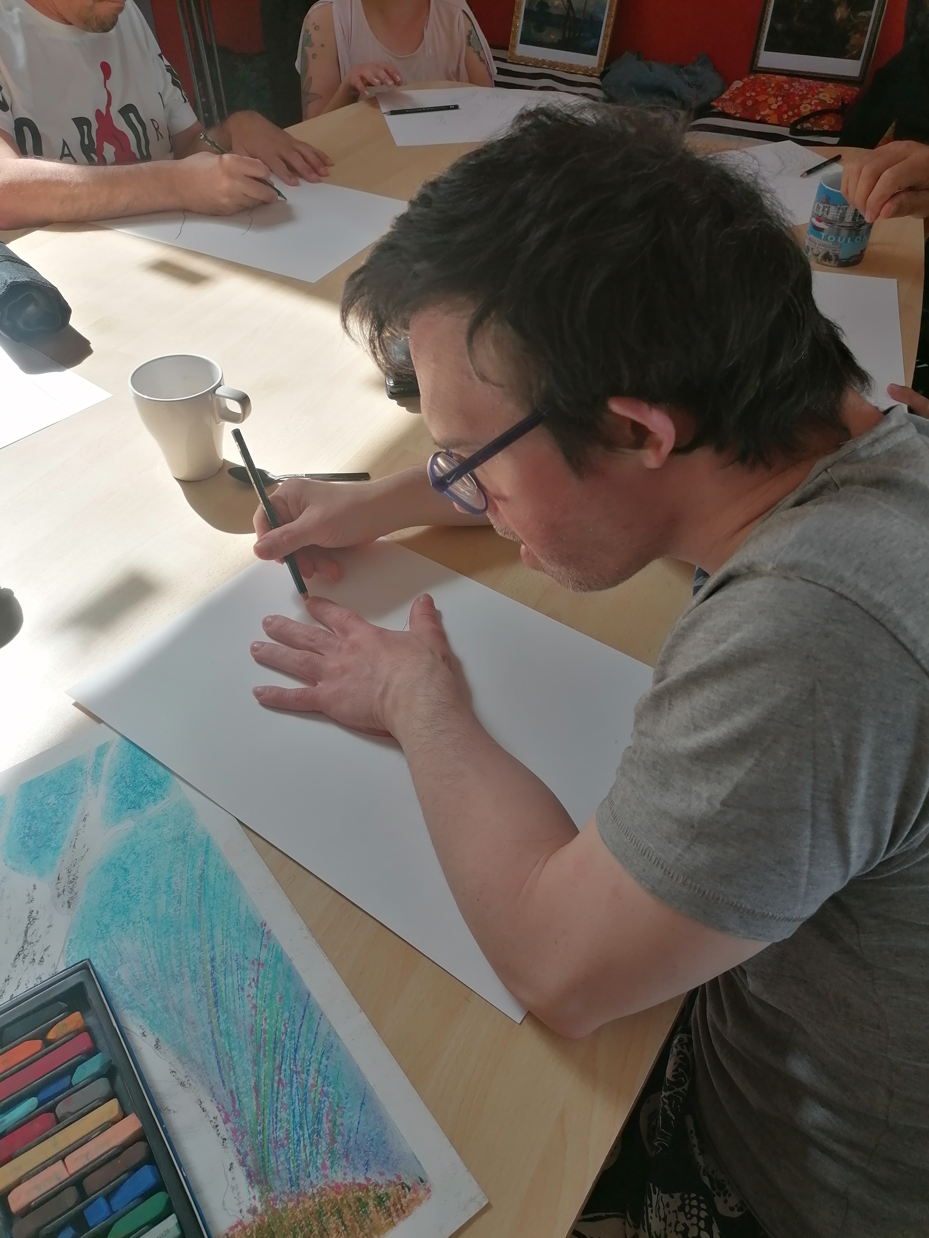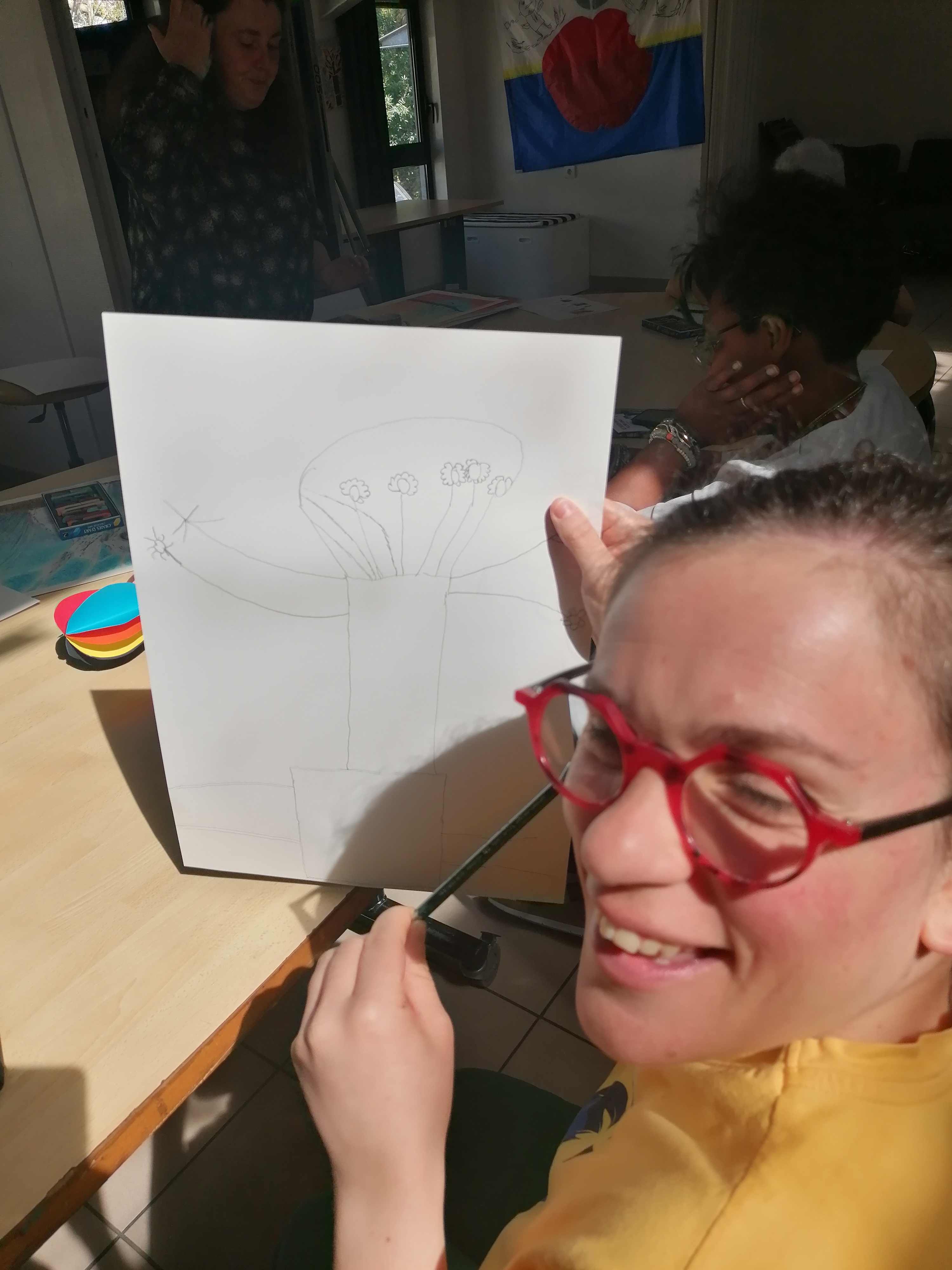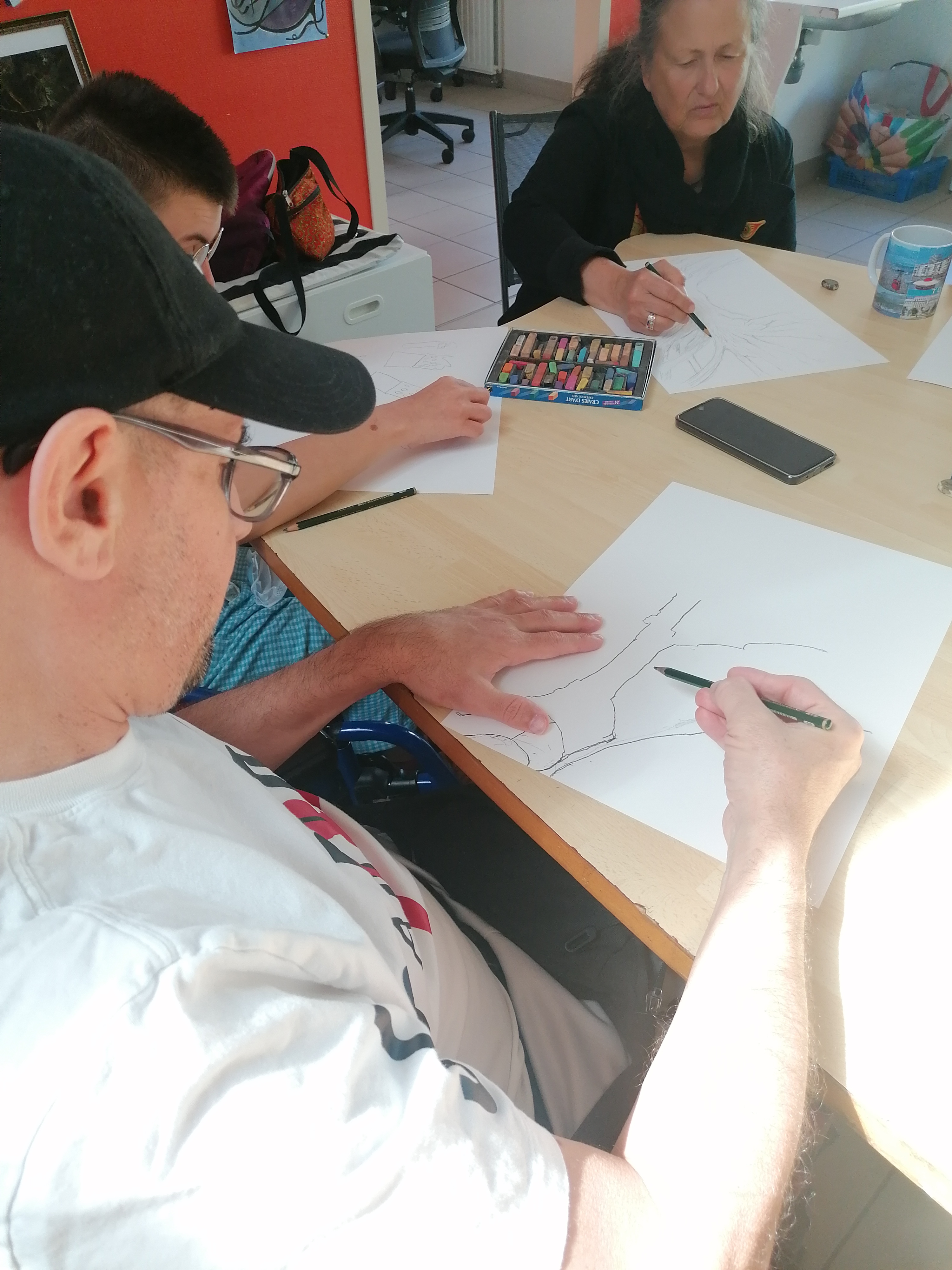 Le groupe s’est pris au jeu et a réalisé de très beaux portraits d’arbres. C’est toujours un plaisir de dessiner, de jouer avec la matière pour faire apparaître des formes et des couleurs. Cela permet de s’évader et de se concentrer un temps pour éveiller l’imaginaire et la créativité de chacun.