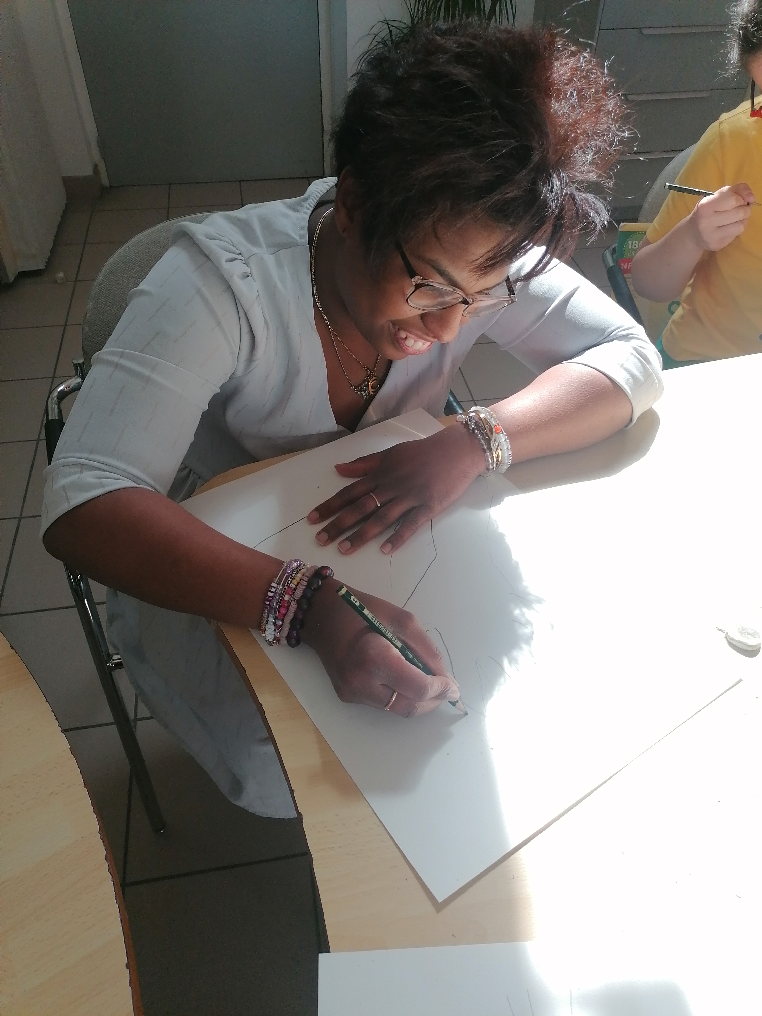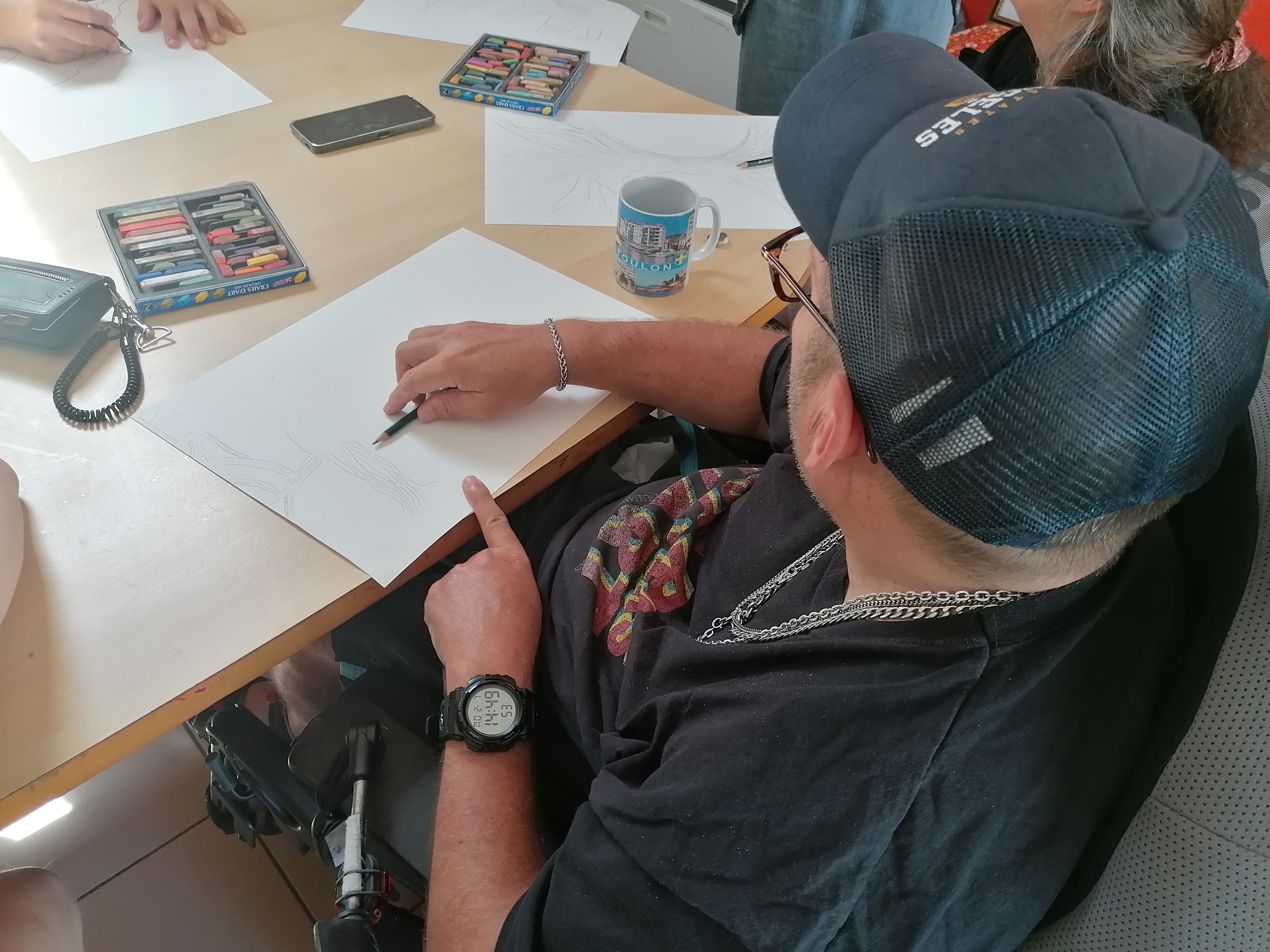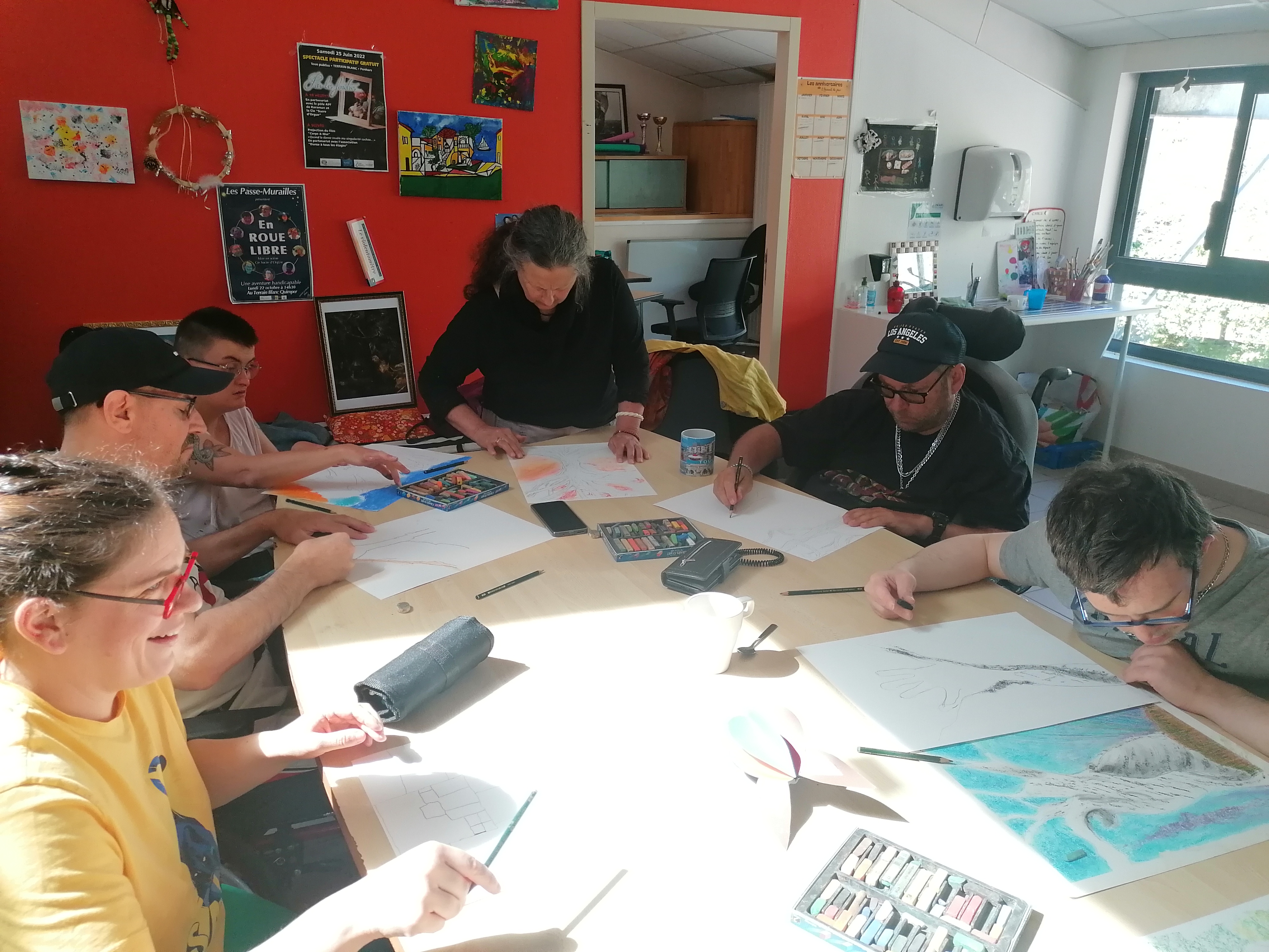 Le groupe s’est pris au jeu et a réalisé de très beaux portraits d’arbres. C’est toujours un plaisir de dessiner, de jouer avec la matière pour faire apparaître des formes et des couleurs. Cela permet de s’évader et de se concentrer un temps pour éveiller l’imaginaire et la créativité de chacun.