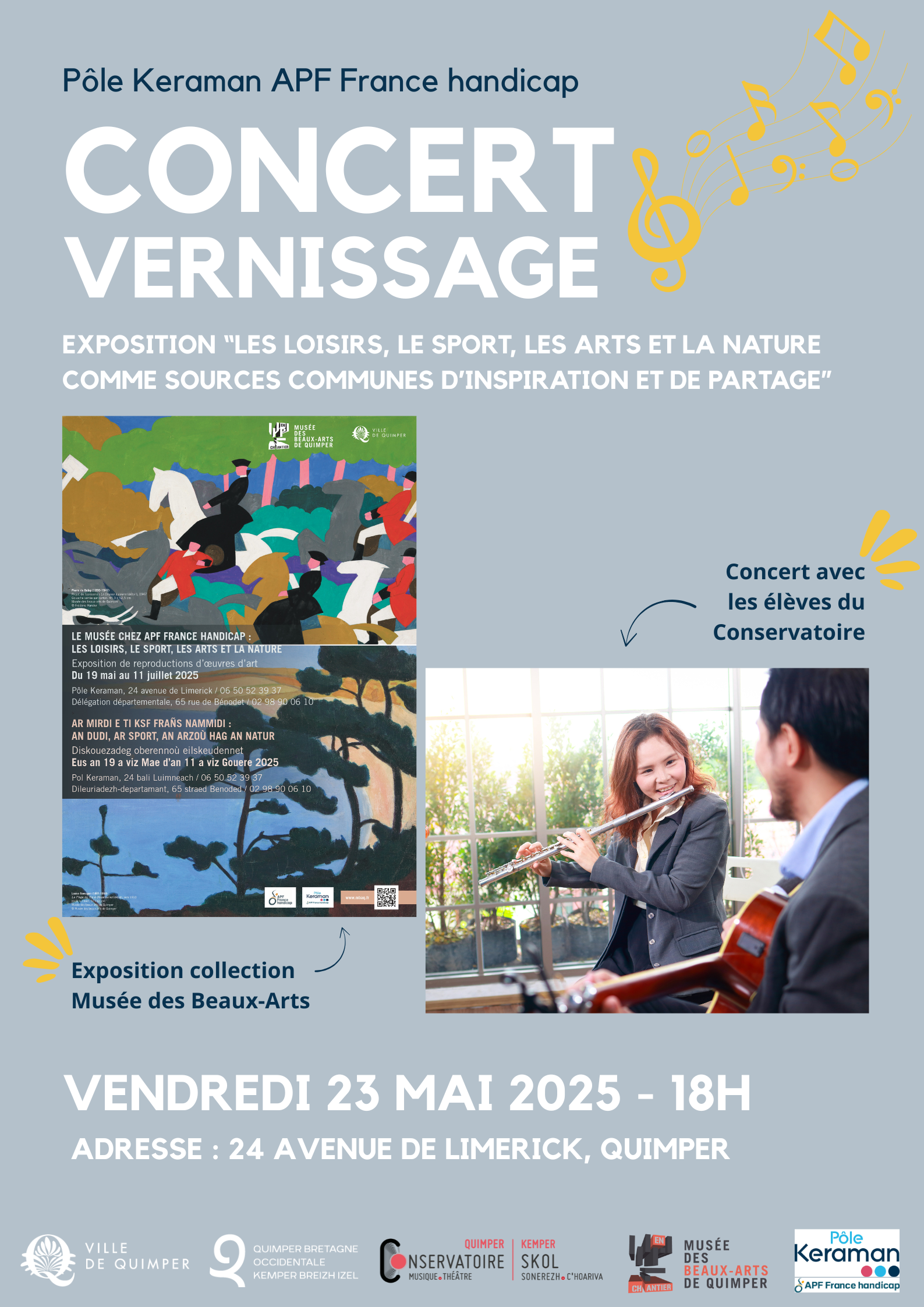 - Concert/Vernissage le vendredi 23 mai à 18h avec des élèves du Conservatoire de Quimper (flûte et guitare), sur la terrasse ou dans la salle de restauration en fonction de la météo avec un pot pour célébrer l’évènement. -> Pouvez-vous nous préciser votre présence avant le 16 mai, afin que la cuisine puisse organiser les commandes dans le cadre du pot. Merci