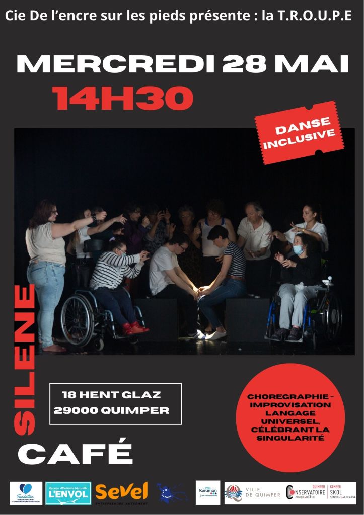 Notre troupe de danse inclusive, récemment baptisée La T.R.O.U.P.E et portée par la Compagnie De l’encre sur les pieds représentée par la chorégraphe Laure FOUARD, se produira le mercredi 28 mai à 14h30 au Café Silène à Quimper.